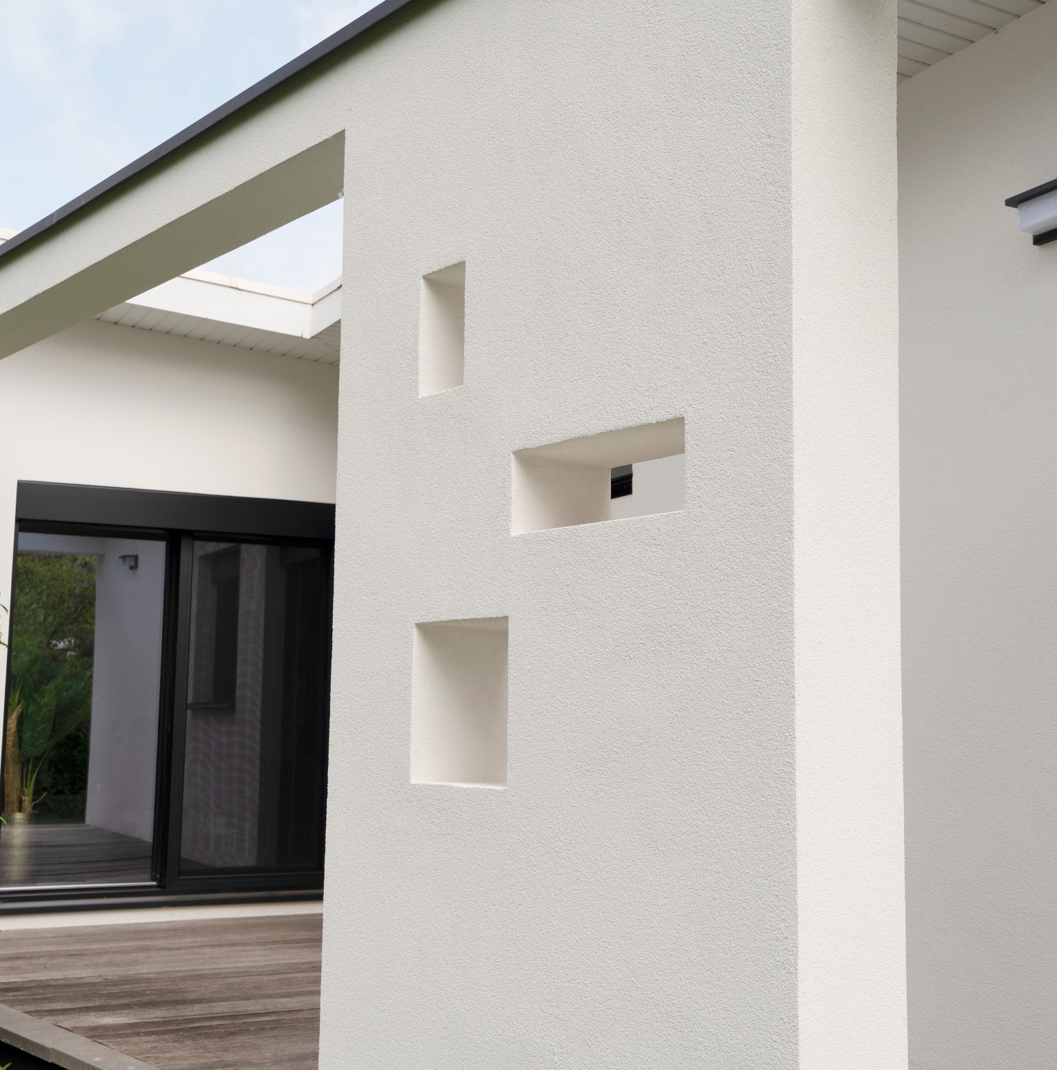 Les nombreux coins et volumes en retrait ont rendu ce projet encore plus difficile. Tous les raccordements ont été soigneusement étudiés pour que le crépi soit homogène et régulier. Le résultat est une façade rénovée qui est techniquement correcte et qui donne à la maison un aspect contemporain et soigné.